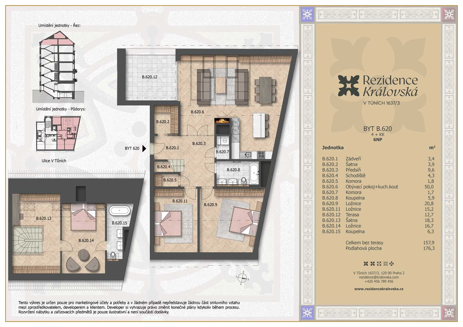 Náš největší mezonetový byt je vybaven krbem na tuhá paliva, který dodává interiéru příjemnou atmosféru. Klimatizace umožňuje snadné nastavení teploty v každém ročním období. Prostorná terasa s inovativním systémem zastřešení nabízí možnost grilování a relaxace po celý rok.