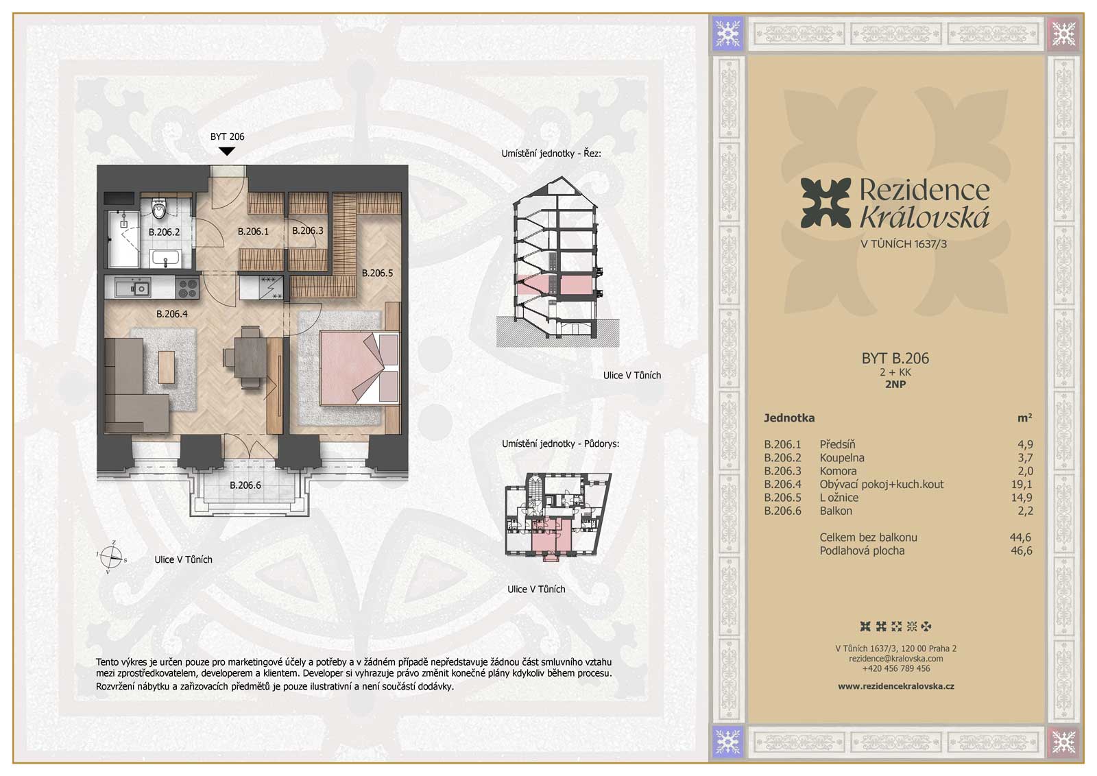 206 | 2.NP | 2+kk | 46,6 m2 | 2,2 m2 | 44,6 m2 | rezervováno | Stáhnout | |