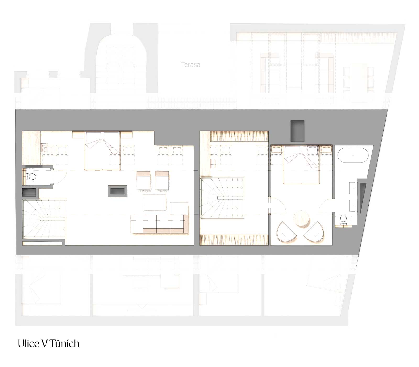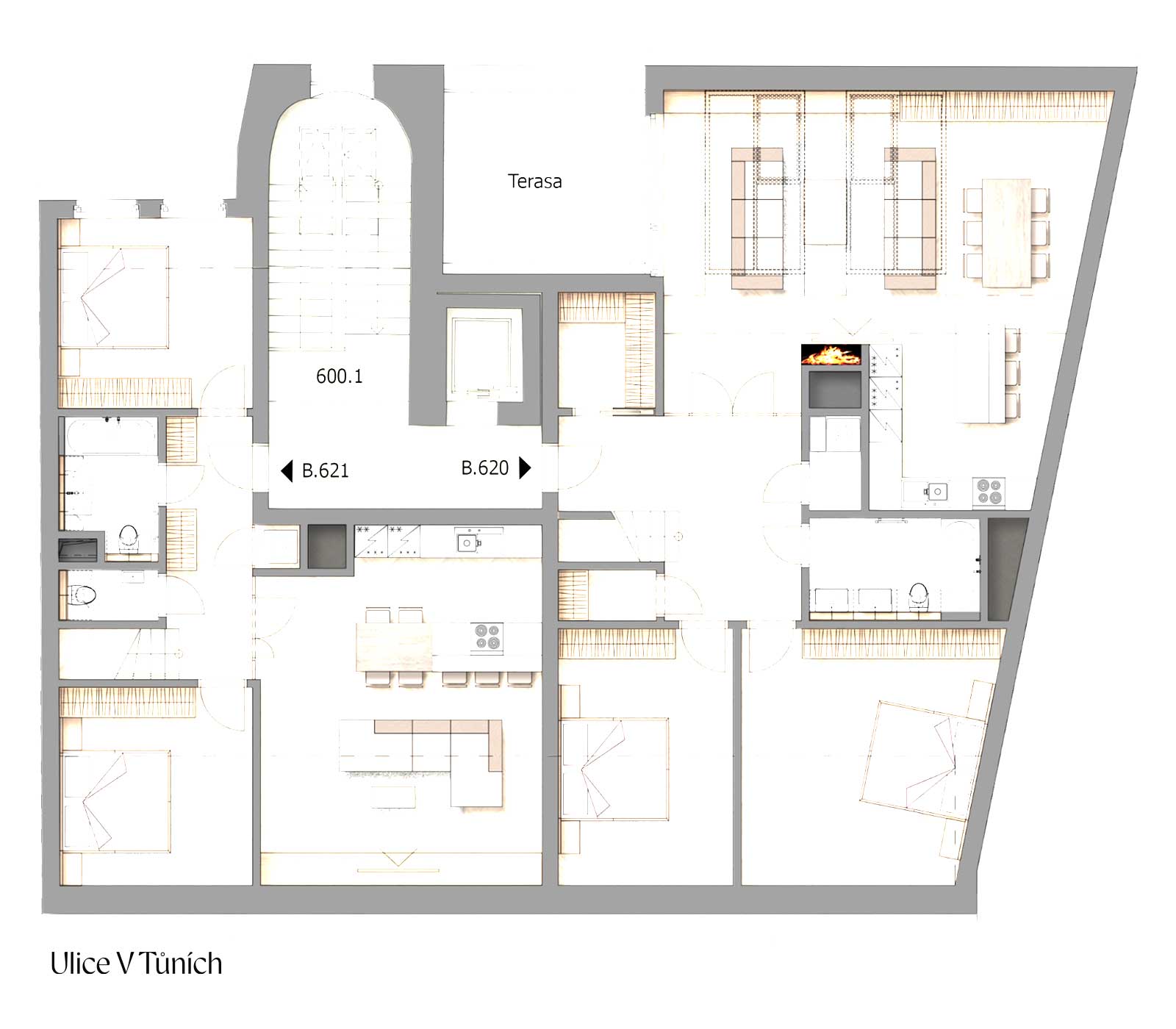 V horním 6. patře na vás čekají dva luxusní mezonetové byty 3+kk (130 m2), jeden z nich navíc i s krbem a nádhernou terasou (54,1 m2). V obou bytech se nachází velká plošná okna, díky kterým můžete každý den zažívat dechberoucí výhled na Pražský hrad a panorama města.